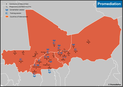 Promediation mène un projet régional de 36 mois, soutenu par le Fonds fiduciaire d’urgence pour l’Afrique de l’Union européenne, visant à renforcer les capacités de dialogue et de concertation des forces de sécurité dans des contextes de conflit et d’insécurité au Burkina Faso, au Mali et au Niger. En renforçant les capacités de dialogue des unités FSI dans ces trois pays, l’objectif général de ce programme est de faciliter les relations entre les populations locales et les éléments FSI. La méfiance accumulée depuis des décennies entre les populations locales vivant dans les zones périphériques, souvent issues de communautés nomades, et les représentants de l’État constitue en effet un défi majeur dans la lutte contre l’expansion de la violence armée.